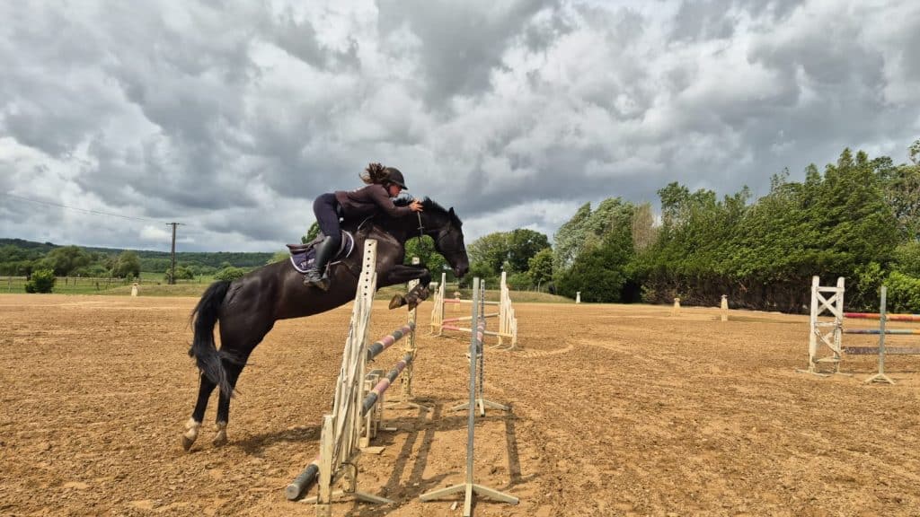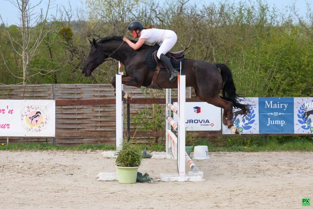Nous avons testé une épreuve de puissance, et la jument avec laquelle je concours régulièrement sur amateur1 a franchi 1m55 sans difficulté. J’ai choisis de ne pas utiliser de mors car, sur un obstacle isolé à la maison, il n’y avait pas de pression. Je connais cette jument par cœur et elle me connaît tout autant.